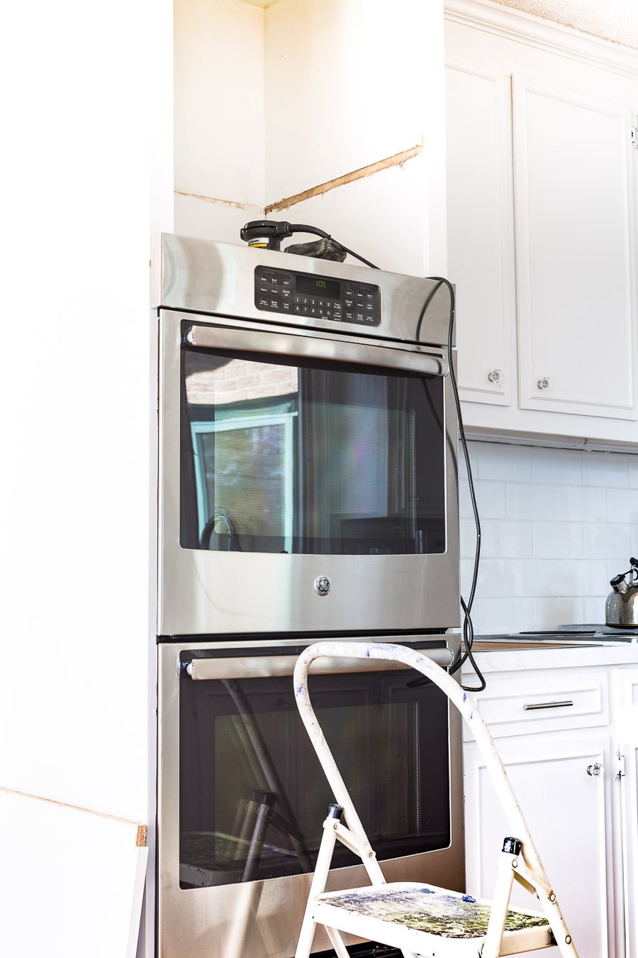 Hello new GE oven. A shiny stainless steel one. :-) It was installed this morning. I love it, but installing the new ovens required ripping out the shelves above that I had already painted.