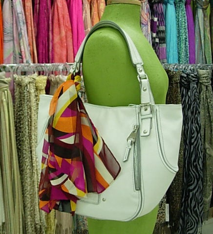 Silk scarf tied around the handle of a tote bag.