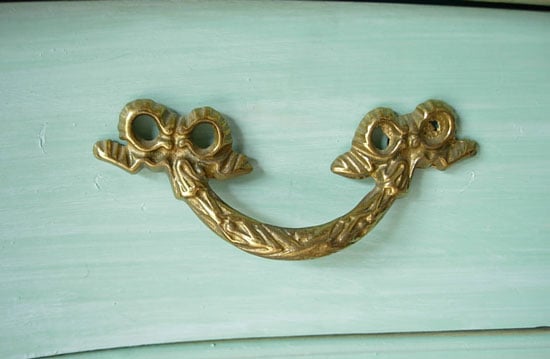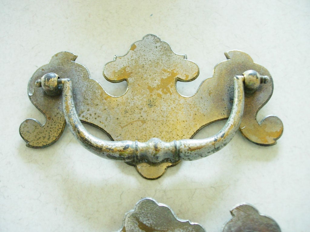This is how the brass drawer pulls looked after I cleaned them to prepare for spray painting. You can see the one at the bottom has a bit of silver on it. I tried using Rub N’Buff on that one, but I could not get it into the detail of the pull so I opted to use spray paint.