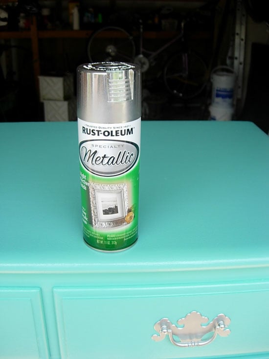 I used Rust-Oleum Specialty Metallic Spray Paint in Silver for the drawer pulls. I applied 3 light coats, letting each coat dry thoroughly before spraying on the next coat. They came out so much better than I expected. I just love this brand of spray paint.
