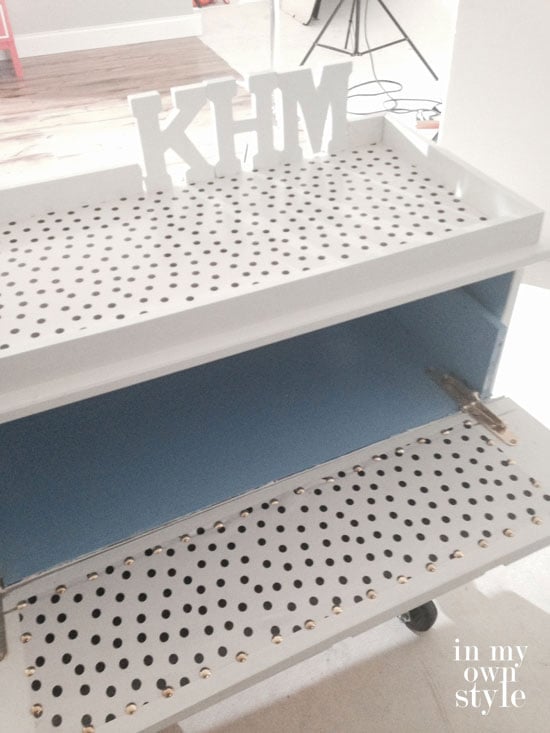 I cut oilcloth to fit inside the tray top and for the back of the top drawer front. I used spray glue to attach it.