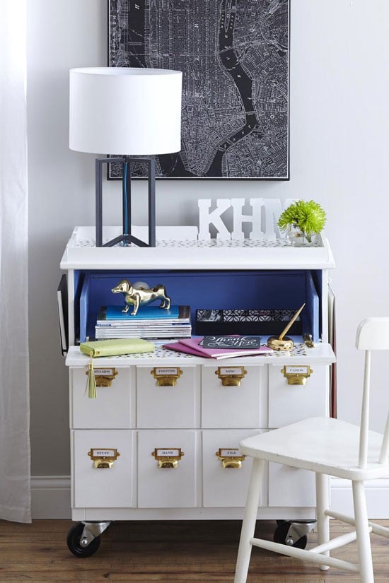 Optional: I considered adding bun feet to the desk so it would look like the vintage file cabinet that got me into the Makeover Madness challenge in the first place. I went with the wheels, but if wheels are not your thing – bun feet can be attached to the bottom of the dresser instead. The legs will still need to be cut off and 4 straight-top attaching plates will need to be mounted on the underside of the dresser.