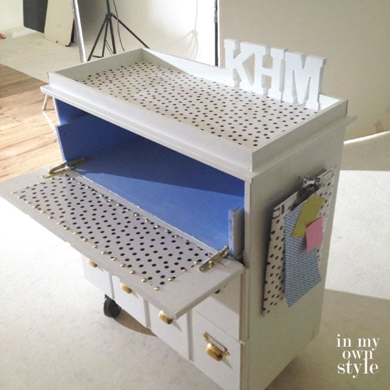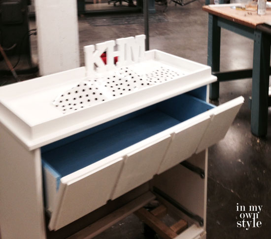 The idea to make it into a desk came from a desk that was in my college dorm room at The Fashion Institute of Technology in NYC. It was a very smart piece of furniture that had 3 functions. Built-in shelves above the desk drawer, and drawers for clothes under the top drawer that was the drop down desk.