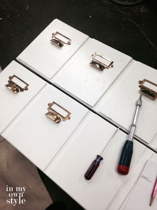 Attach the label pulls with the screws provided in the kit. To make it easier to line them up,remove the drawers and line them up in order on the floor.