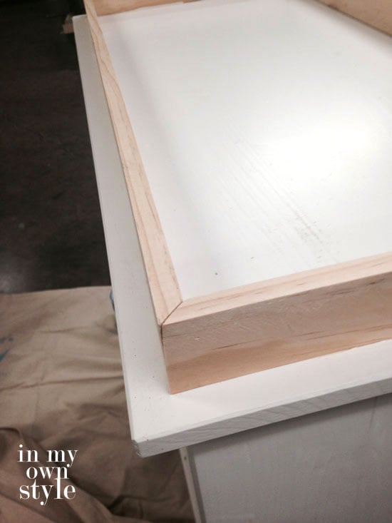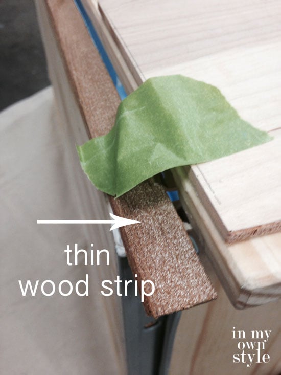 The last thing that needs to be done is to add a very thin strip of wood to the underside of the drawer front. This is needed to hide the drawer glides. I made it by cutting a scrap piece of wood wafer thin. You can also use iron-on wood veneer along the entire bottom edge. I used Liquid Nails to attach and added the tape to hold it in place since time was up and the dresser had to be moved to the photo studio.