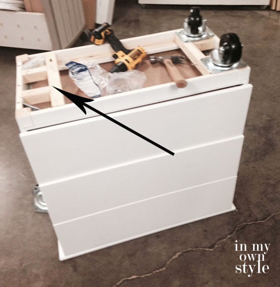1. Assemble the dresser following the IKEA supplied directions with two exceptions: Don’t assemble the top drawer and move the top drawer glides down 1″ (see step 3).