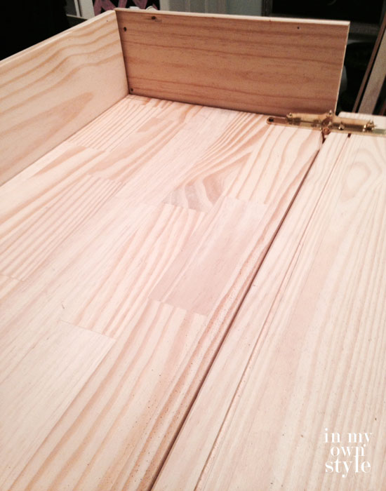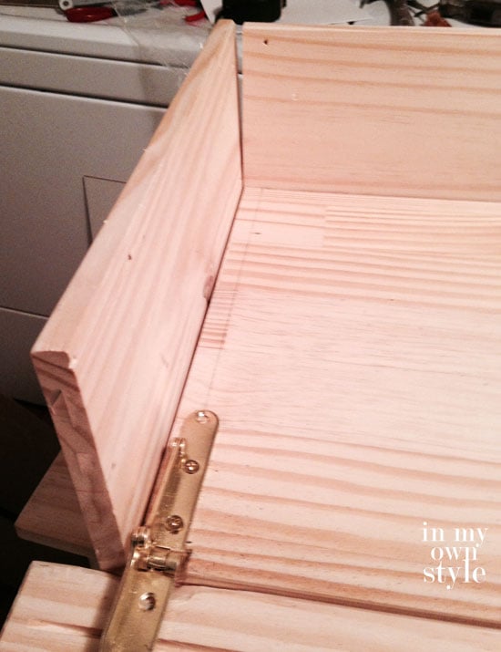To attach the front of the drawer – Place assembled drawer on a flat work surface, lay drawer front panel in front of the drawer face down. Center it on the drawer. Place desk hinges in and mark placement of screws and where hinge falls. Put hinge in “L” position and make sure it is flush with the sides of the desk. Since my bottom board was 3/4″ pine, it was soft. I cut out a space with a craft knife along the edge for the hinge to rest in so it would be flush with the top of the board. You could use a hammer and a chisel, but I did not have them. Repeat cut out for hinge on opposite side. Pre-drill holes for screws and then attach hinges.