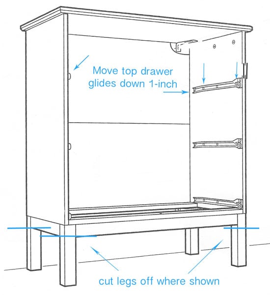 2. Once assembled, use a saw to cut off the legs flush with the dresser bottom.