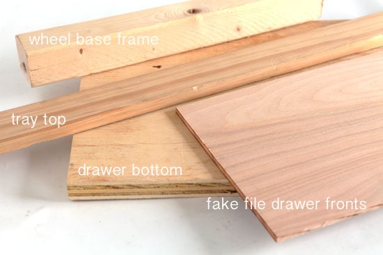 Fake file drawer front: 1/4″ birch or Aspen plywood cut into twelve pieces: 6 – 1/2″ x 8 – 3/4″