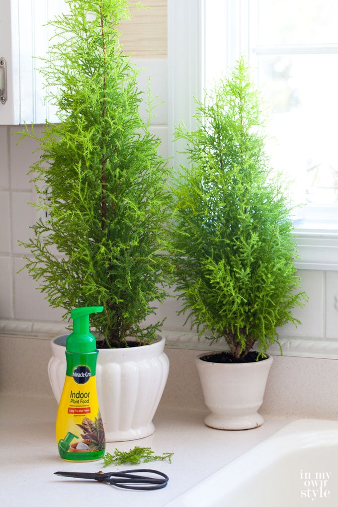 When I realized they were going to make it, I read up on how to care for them for the long run.  Plant food was recommended as well as periodic trimming. I pump a few squirts of plant food on each plant once a month.  Every few weeks, I use a pair of scissors to trim stray branches so they keep their pyramidal shape. Before Christmas, I added some fresh soil to each pot.