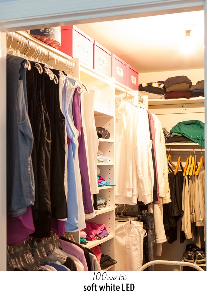 A simple solution for my dark closet.  Now everything looks true to color and is not too bright or glaring. Thanks Anne for giving me a true “lightbulb moment.”