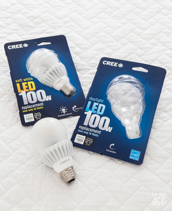 I went out and about to search and find a few new bulbs and came home with a 100 watt soft white LED along with a 100 watt daylight LED bulb from Cree. If you are not familiar with Cree LED’s, they are a bit more expensive, but will last 25 times longer and use a fraction of the energy than an incandescent.