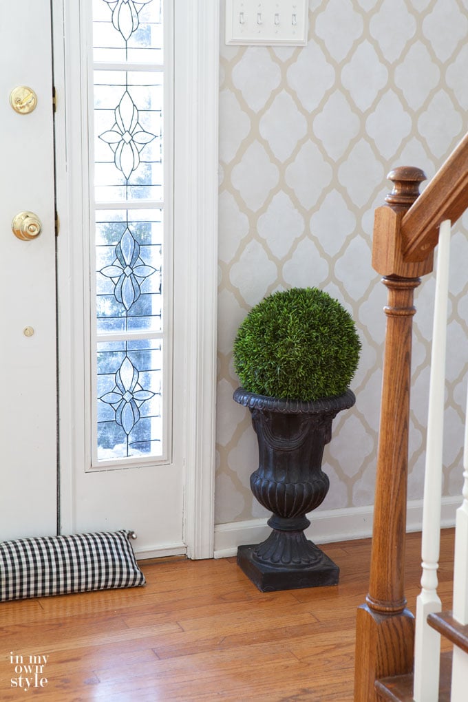 The foyer looks great and I love that stencil you did ~ glad you did not paint over those walls. You got lucky at Home Goods with the doorknobs. Love those and that topiary ball also. I see your Gallery Glass “stained” glass on your side lights still looks great. I’ve been working on the lower half of my downstairs bathroom window. I have all the leading done but I keep changing the texture of glass in different areas. Mine is like your, no colors, but I can’t decide if I want frosted in some areas or pearl, etc… I’m lucky that alcohol takes the medium off and it’s easy to change. I’m looking forward to seeing pictures of the foyer put back together. Stay warm. Vikki in VA