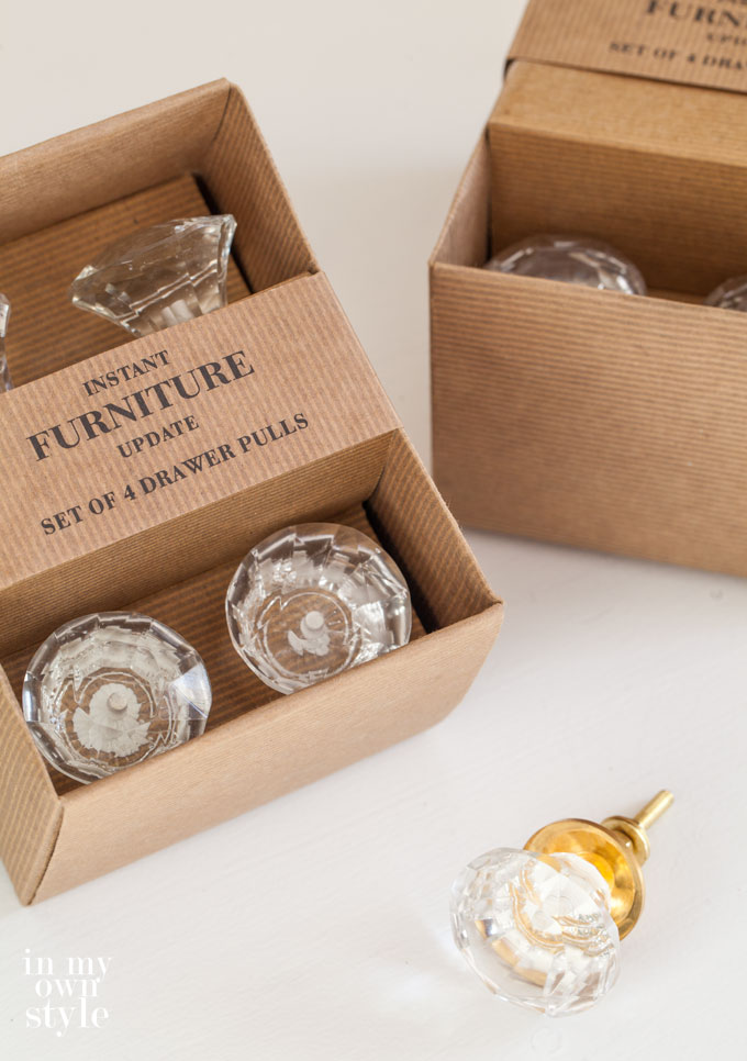 While I was in the check-out line at HomeGoods to pay for the hand soap and topiary, I saw these glass furniture knobs. It was one of those meant-to-be-moments. I have been looking for knobs for the dresser in my bedroom for months, but everything I liked was too expensive. These were a bargain – a set of 4 for $7.99! I needed 8 knobs. Wow! $16.oo for 8. Large glass knobs like these are at least $8 a piece everywhere else. I am excited to get my dresser painted now.