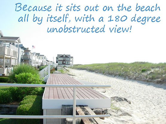 All the other houses that line the beaches here are all in a line and only get a one sided- frontal view of the beach and water. Corner lots get a 90 degree view. This home survived a hurricane in the 50’s or 60’s. They never rebuilt homes out that far after that. I like it’s loneliness. It used to be green and white, but it has had a makeover or two over the years. There is a wall built around it now – for protection, but when I was a kid there were no dunes, just flat beach right up to the bulkhead. I remember playing right where the planter is in the the photo, as there used to be a foundation left from another house or I remember people saying it was a hotel. It was like playing on ruins. If the tide was high, you could ride on your raft right up to the house and the ruins next to it.