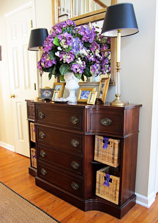 I just ran upon your blog, and what a treat! I am sorry to hear about your husband, I hope he finds something very soon. You have great style, I love your splashes of purple both in the foyer and the guest bedroom!