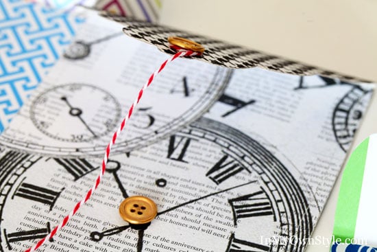 - Use a small dab of hot glue on the center back of a button. Place one button on the bottom center of flap and a second button on the body of the envelope about a 1/4″ below where flap ends.