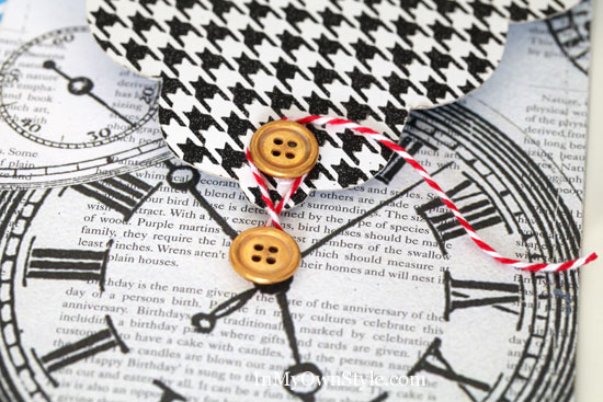- Cut a piece of Baker’s Twine to 8 inches. Wrap one end around top button, pushing the end of the twine into center under button to touch the glue. This will secure it. Let glue dry, and then wrap the twine “Figure 8 style” around the two buttons.