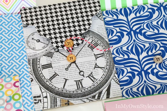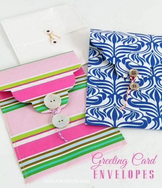 Use gift wrap to make your envelopes. TJ Maxx, HomeGoods, and Marhalls always have trendy and fun designs.