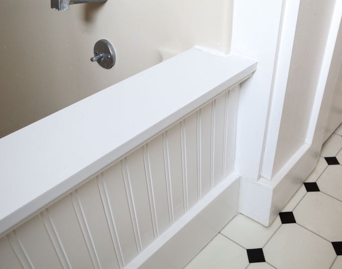 I am redoing my hall bathroom. I saw your post several years ago and here I am back again. :) I love it! Is there any chance I could see a picture of what it looks like at the top of the shower, where you added the trim board on the sides? I imagine that you made it look okay, because everything else looks great! I don’t have a window or anything, so I am not sure how I would make it look right.