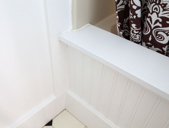 Build the frame with 2 x4′s, but stop about an inch or two below the top of the tub. So that when you add the cap/top PVC board (doesn’t have to be PVC) it is slightly lower or flush with the top of the tub. Attach the bead board, bed molding in the same way I did. The cap/top goes on last and sits on top of the frame.