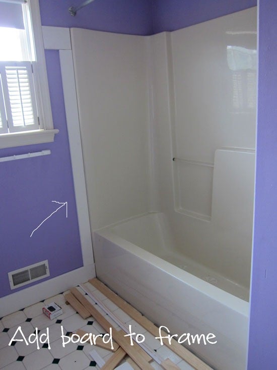 I started by creating a frame of wood along the wall on each side of the tub and the floor. I am going to be adding board/batten/bead board in the room and the frame on either side of the tub will be part of this. I am using 3 1/2” wide Mdf for that.