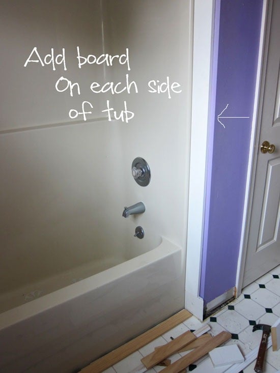 If you have the space and a regular bathtub not the molded kind I have you can add the molding and paneling in a slightly different way so it sits outside the tub itself and does not wrap over it. I had to do it the “wrap over” way because of the tub I have and space restraints. At the end of the post I added how to add the frame and molding that doesn’t wrap over the top of the tub.