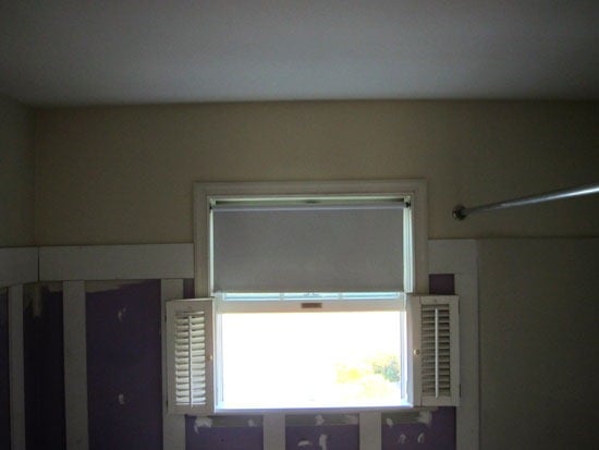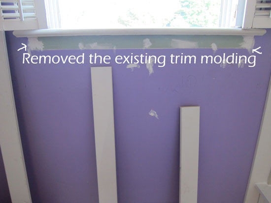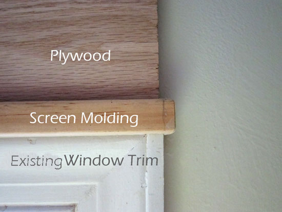 I added crown molding to the top of the plywood and a piece of screen molding to hide the joint between the board and the existing window trim.