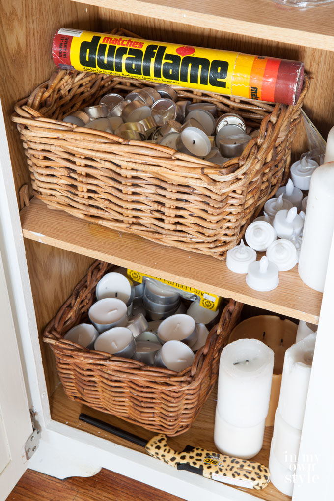 For the candles and holders I like to place all around, I employ a cabinet in my kitchen.