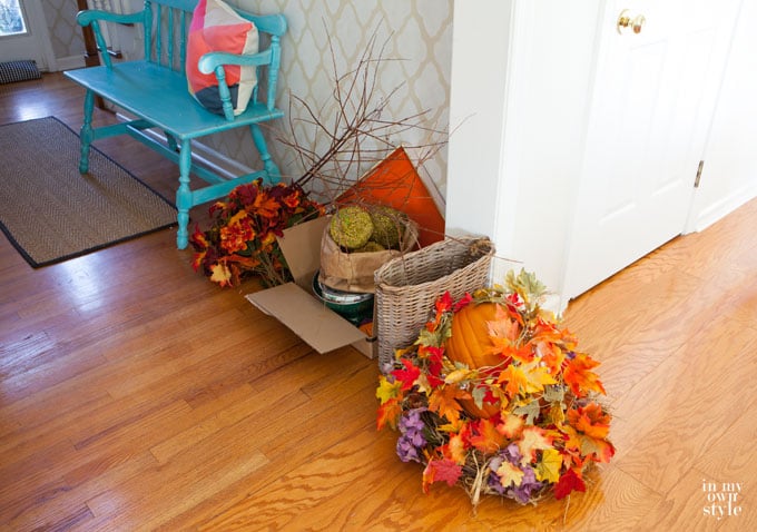 Most of the decorative seasonal decor I use goes to my basement. Goodbye fall decor…you are on your way… down.