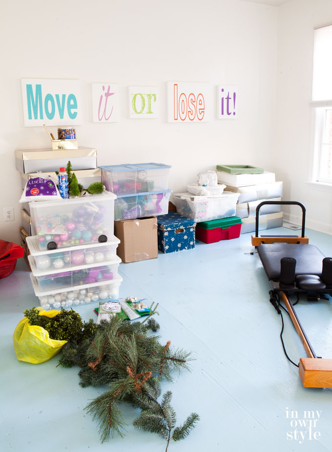 Once the decorations are up, I will stack the bins and boxes in the corner of the room until it is time to take the decorations down in early January. I usually organize and clean out what I don’t need in each box before they go back up to the attic.