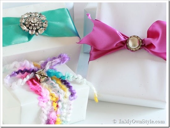 Satin ribbon, yarn, along with embellishments of jingle bells or vintage pins and earrings wrap it up in elegant ease.