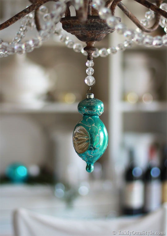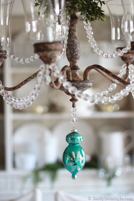 I hung an antique ornament from the chandelier in my dining room. It is really old and the top is broken. I love the shape – perfect drop to hang by itself so I used a dot of hot glue to attach the cap so I could hang it.