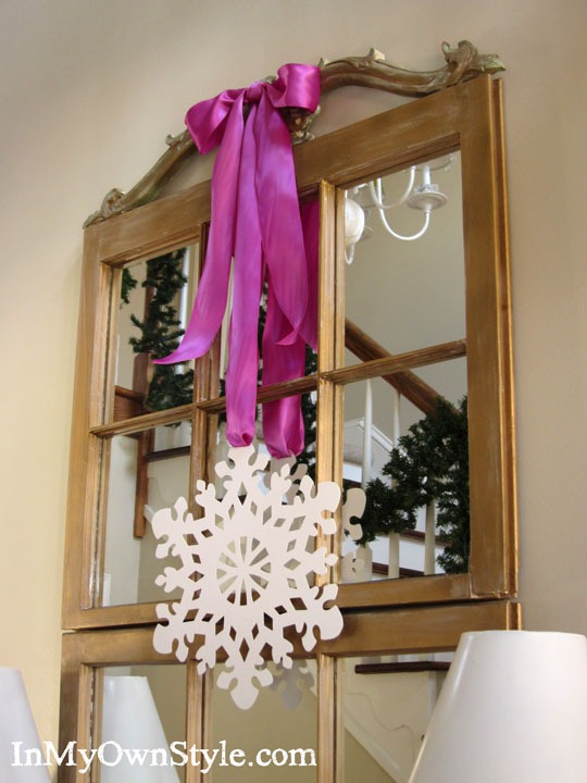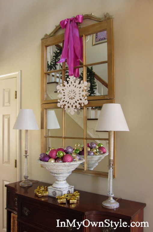 I kept my Christmas decorations simple this year – orchid ribbon, snowflakes, greenery, ornaments, and glitter. This post is a brief tour and recap of what I did. I have written about most of these projects in the past few weeks. If you want to know more – just click on the links.