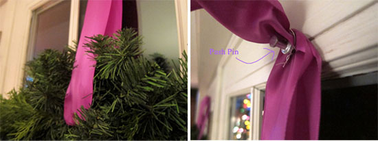 I hung the wreaths on my doors by looping a length of ribbon around the top of the wreath and then used a metal push pin that you can buy at office supply stores to hold it up. I placed the push pin about 7 inches down from the top of the ribbon so I would have enough to flap over the push pin to hide it and also as a little accent.
