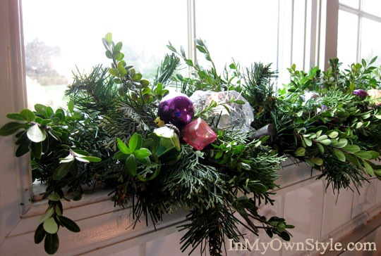 To make my store-bought wreaths look a bit more natural, I added some cedar clippings from the trees in my yard.