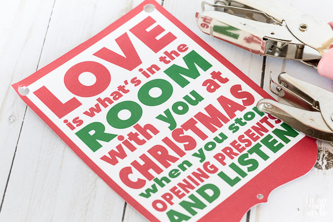 2. Punch 3 holes in cut-out printable. One at each top corner and one at the center bottom.