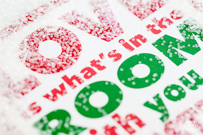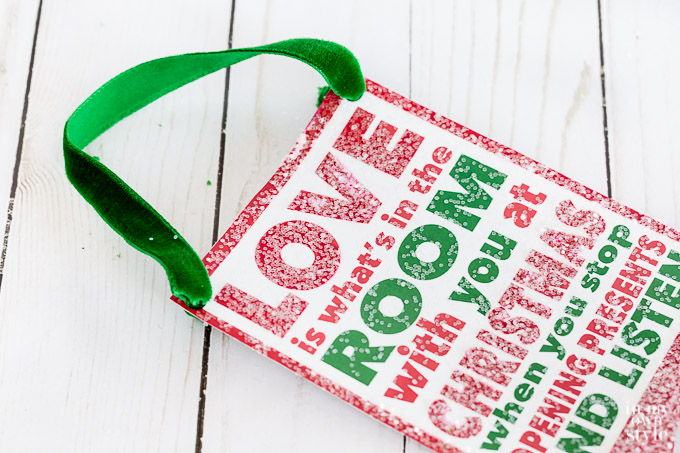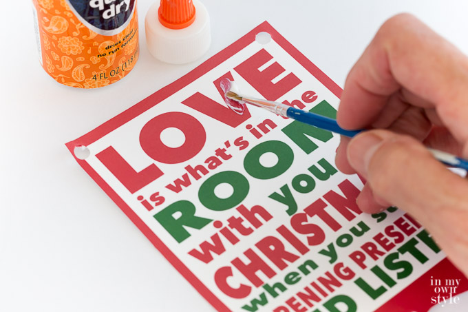 3. Use a fine-tipped paint brush to brush on a layer of glue over letters you want glitter on. I added glitter to the words. LOVE and CHRISTMAS and also on the red border.