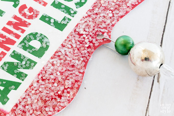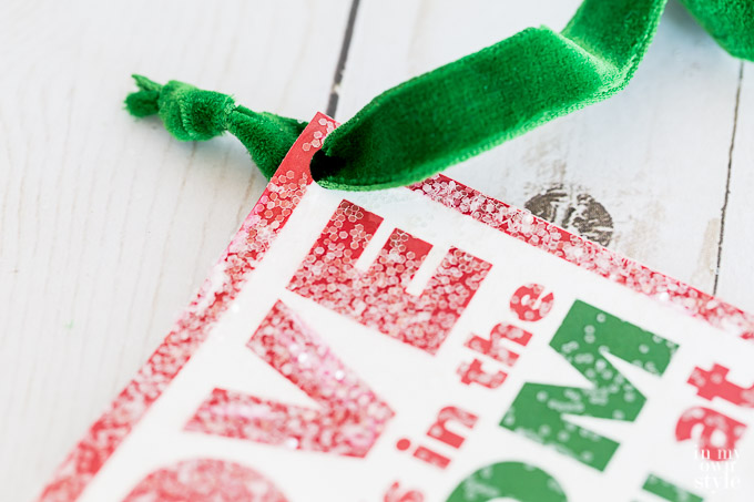 I created the free Christmas printable that you can print, cut out and hang from a doorknob, cabinet knob or anywhere in your home. Add a little glitter, some ribbon and a few beads and voila… you have a little decoration for an unexpected place.