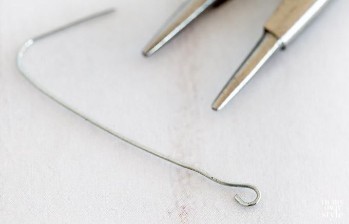7. I used a jewelry finding to make my hanging beads, but in a pinch you can use a wire ornament hanger. Bend it as shown above, attach beads or buttons and then bend top into a loop.