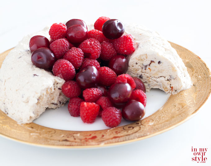 - To serve: Remove mold from freezer; invert onto serving platter. Let stand 5 minutes. Gently tap plate and mold on countertop; slide mold from semifreddo, and remove plastic wrap. Smooth semifreddo with a spatula Garnish with fresh berries and cherries.