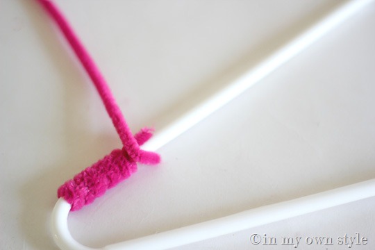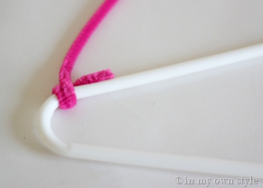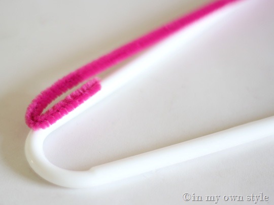 Hi Gloria – I would simply wrap the pipe cleaner around the lower section on each side of the hanger and then wind the two ends together to secure the pipe cleaner. You could also add a little hot glue to the top end of the each side of the hanger and then wind the pipe cleaner right over the hot glue. Once dry it will help keep the pipe cleaners in place on the clear plastic style of hanger.