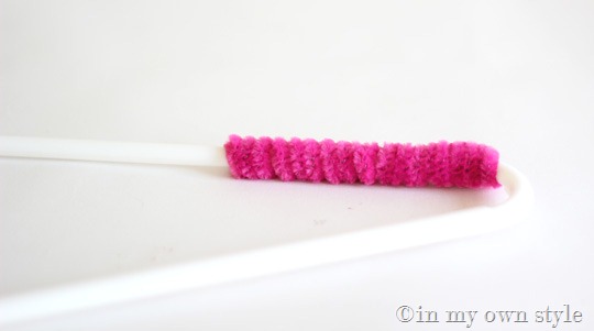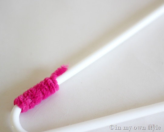 1. To start wrapping the pipe cleaner on the hanger – bend and fold the tip over on one pipe cleaner about 1-inch. Place on top of the end of one shoulder section of the hanger.