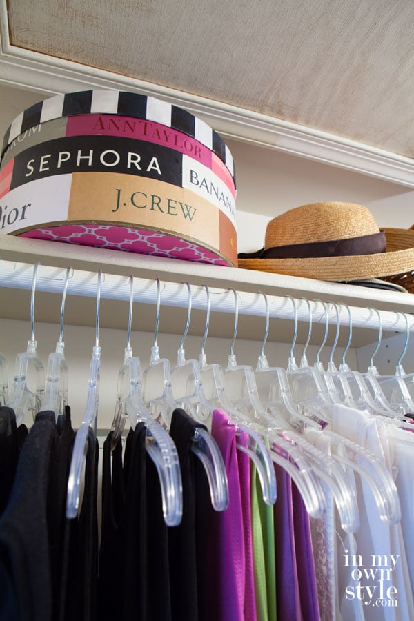 First of all, your closet looks amazing! I am wayyyy overdue to purge my things – as a matter of fact, we really want to add some shelves and do a closet makeover one of these days – It’s on my to do list! The hatbox is a great idea!
