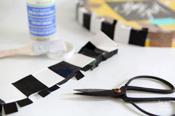3. Figure out placement of each logo and then use decoupage medium like Mod Podge found at the craft store to attach the logos. I always use the matte finish regardless of brand.
