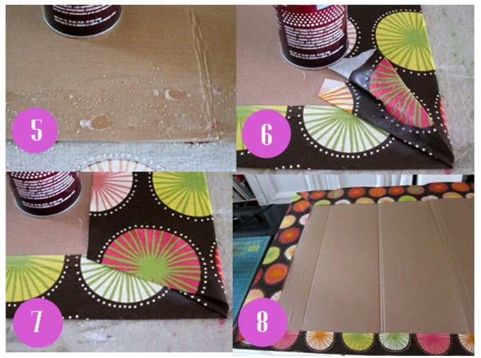 When you use spray glue/adhesive, every single inch of the fabric will stick to the cardboard. To make sure it is stuck at the folds, as you attach the fabric, run your finger or the handle tip of a wooden cooking spoon down each fold or crease as you apply the fabric. If it doesn’t stick, you need to add more spray adhesive.