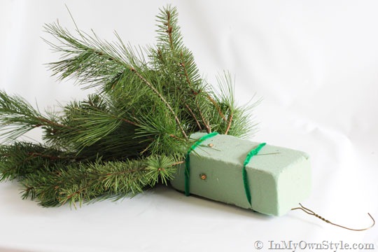 I tied a few small ornaments to the center using a chenille stem (pipe cleaner) and then tied it all onto the greenery with another chenille stem.