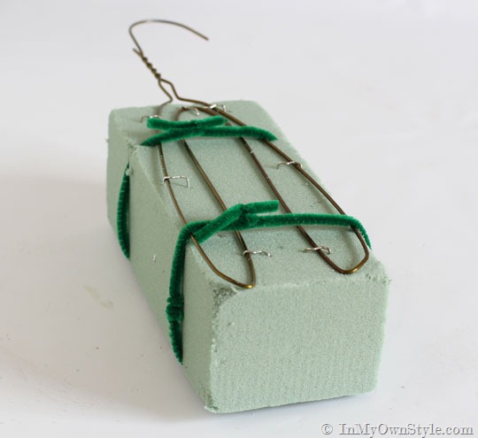 1. Bend the coat hanger as shown and attach with the U-shaped pins. Twist two chenille stems together to create a longer one. Do the same thing with the other two more chenille stems. Wrap and tie them around the foam block as shown. This will be the back of the greenery hanger.