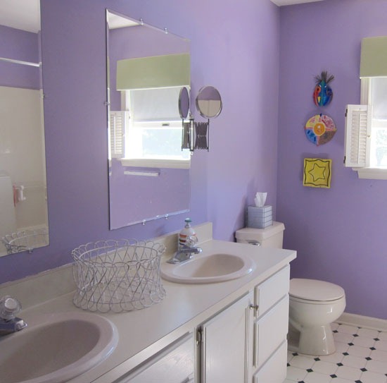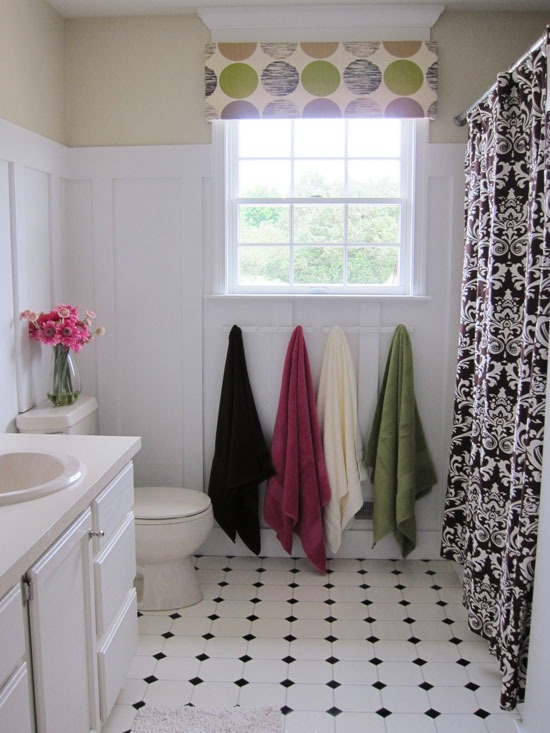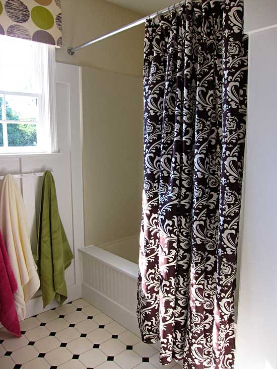While I think the end result is really great, I wonder about the fabric choices you made. The shower curtain has a totally different feel (feminine, traditional) than the window valance fabric which is much more offbeat and modern. The colors in these fabrics do not harmonize or speak to each other either. Could you explain your thinking behind these bold selections? Thanks.