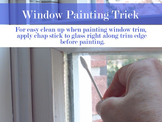 Saw this tip about the Chap-Stick on the Hunted Interior blog. Hadn’t heard of using that or petroleum jelly before! Luckily our house was built new so I won’t have to paint windows for a while, but I was just this week scraping paint off our windows because the professional painters didn’t do it. We’ve lived here for six years and it finally started annoying me!